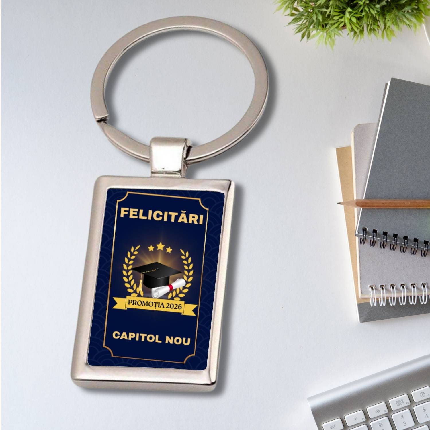 Acest breloc metalic personalizat cu mesaj este potrivit pentru cei care vor să ofere o amintire frumoasă și practică după absolvire.
