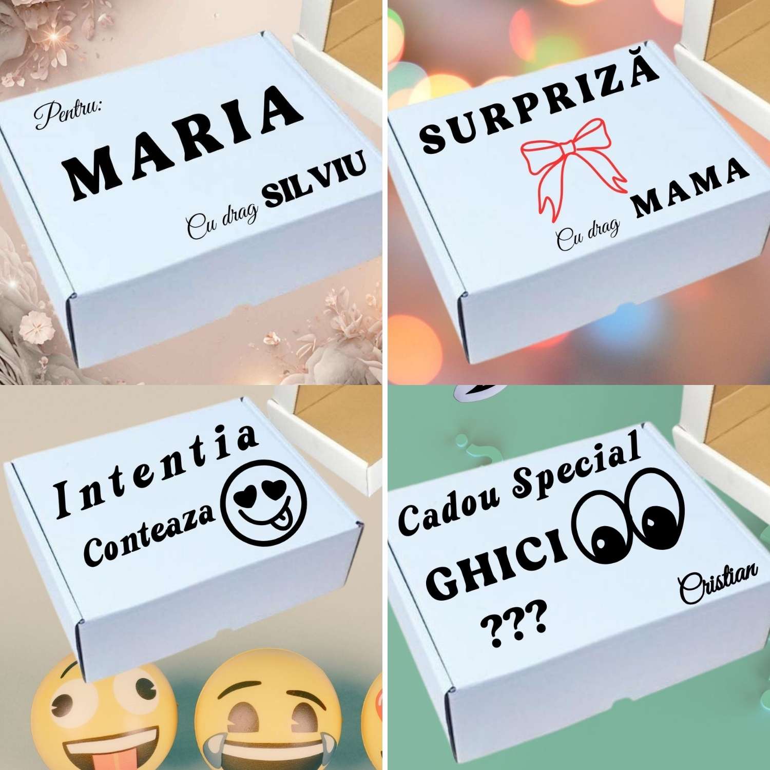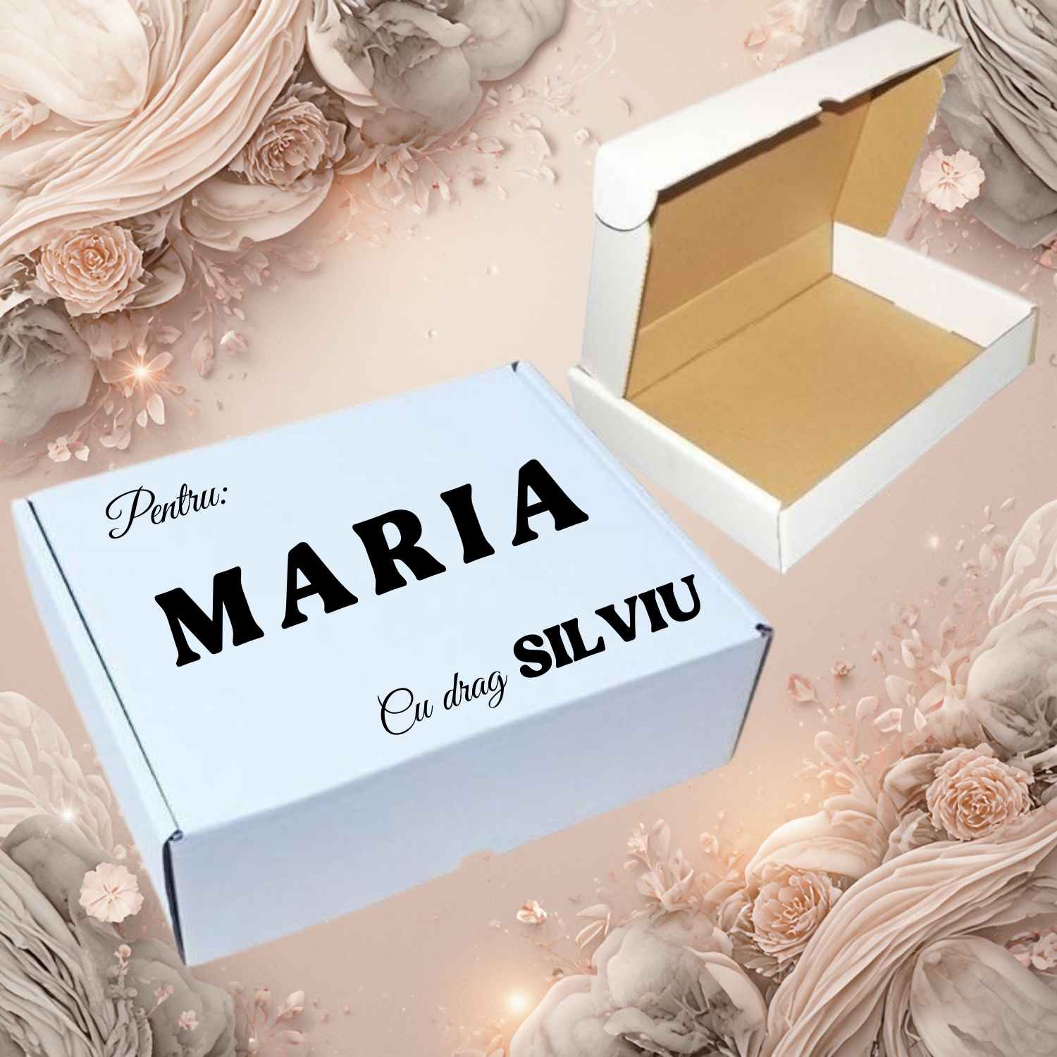 Poți alege un mesaj simplu, emoțional sau jucăuș – de la „Pentru Maria, cu drag” până la „Ghici ce e înăuntru?”. Mesajul este aplicat cu grijă, astfel încât cutia să fie gata de oferit.
