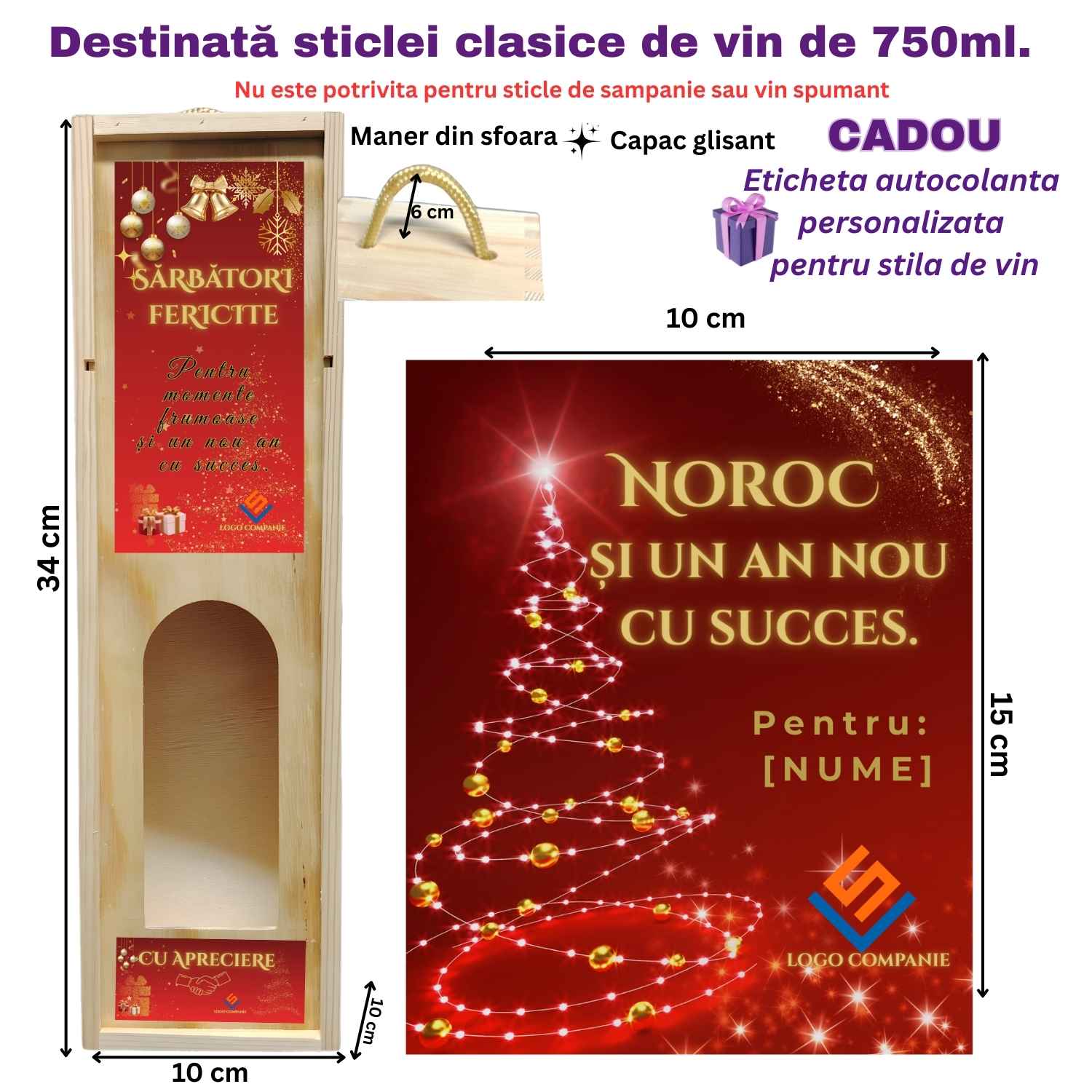 • Cutie de vin personalizată corporate Crăciun cu plăcuță din aluminiu si eticheta autocolanta pentru sticla de vin bonus. Dimensiuni si date tehnice