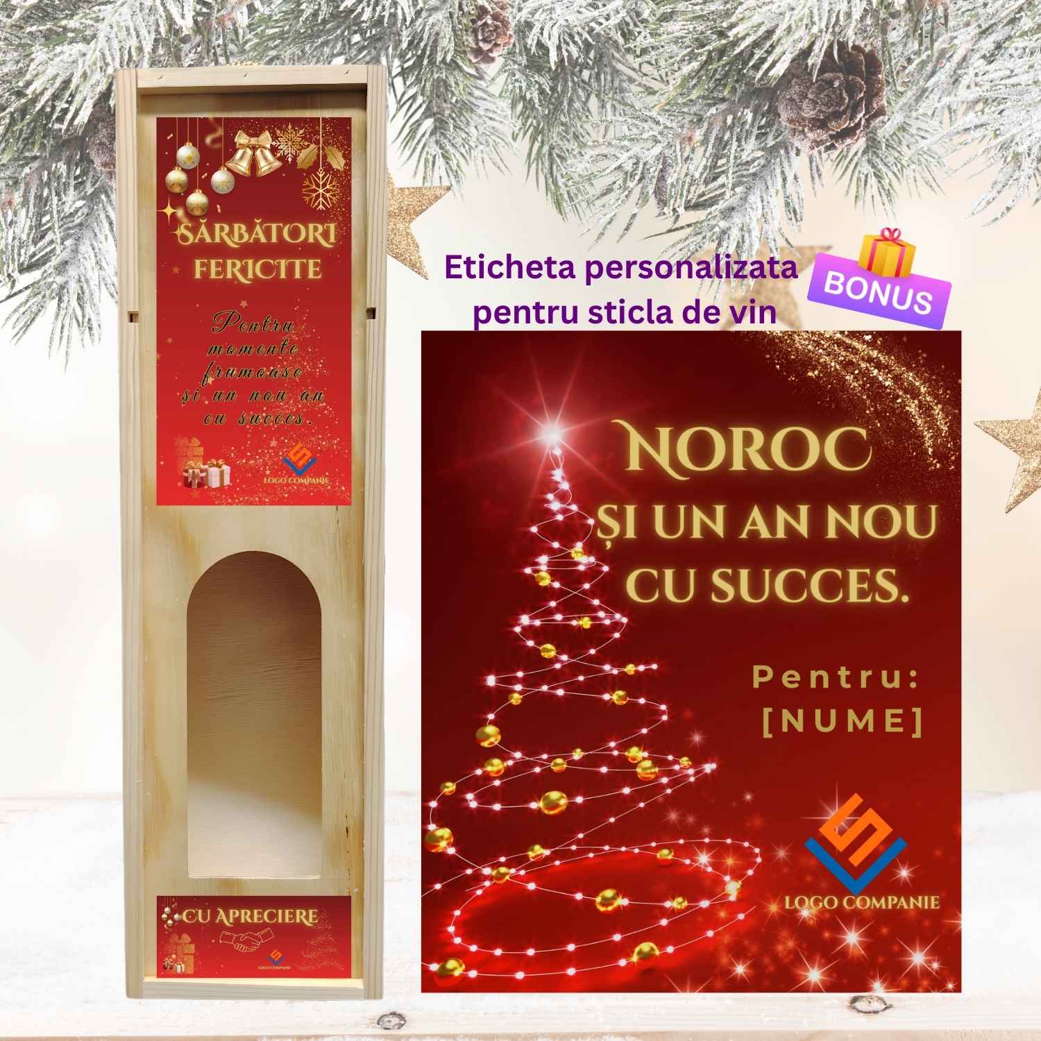 • Cutie de vin personalizată corporate Crăciun cu mesaj Noroc și un An Nou cu Succes, cadou business elegant