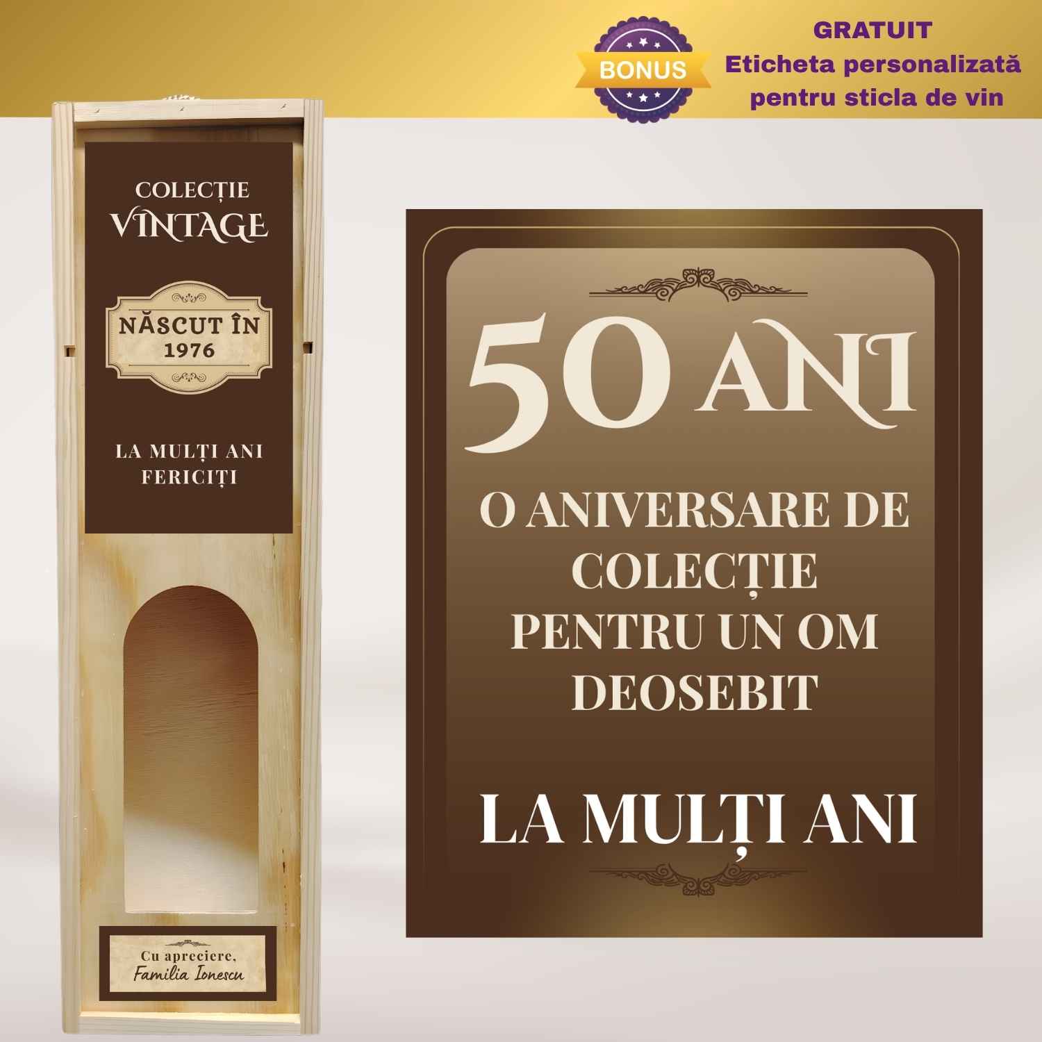 - Conținut pachet: cutie personalizată + etichetă bonus pentru sticla de vin