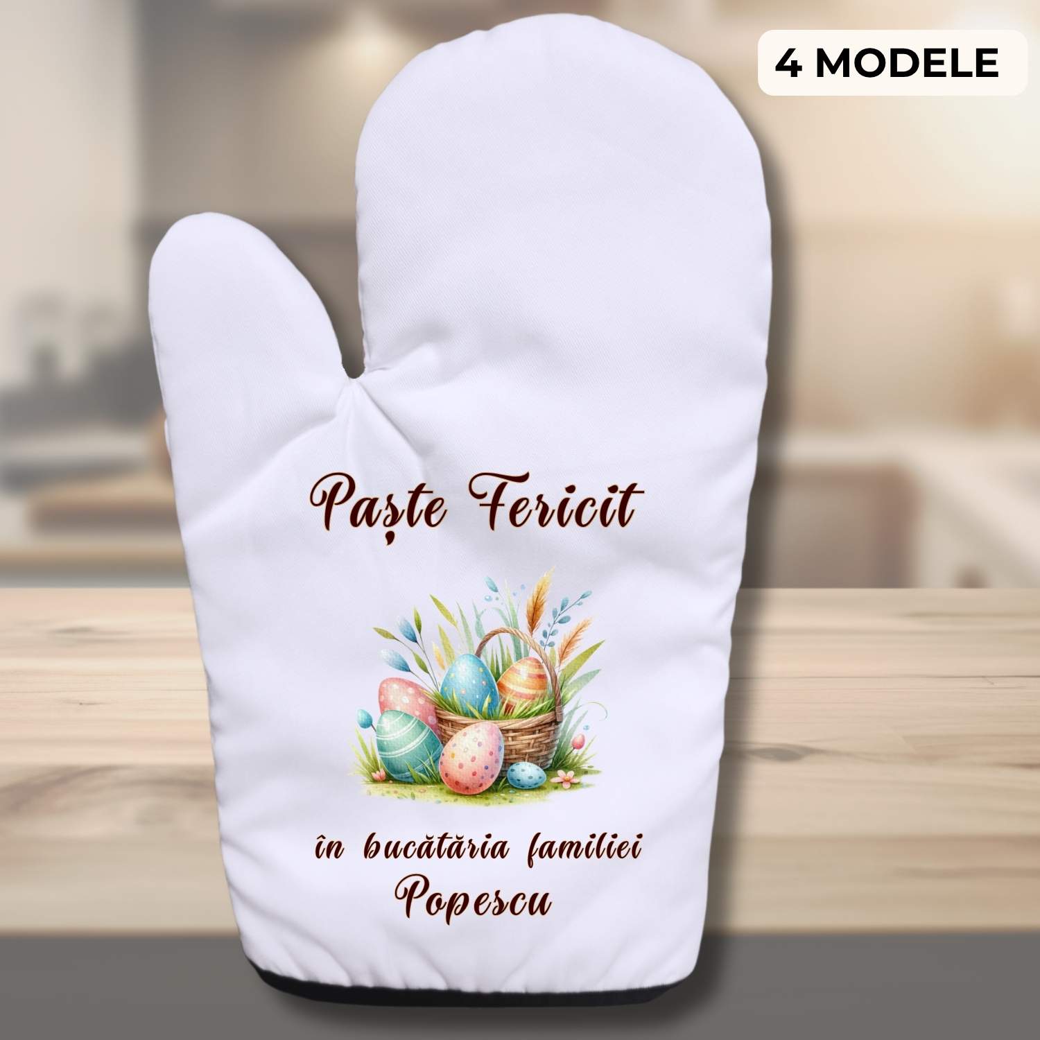 Alege modelul preferat, adaugă personalizarea dorită și transformă o simplă mănușă de bucătărie într-un cadou de Paște util, festiv și memorabil. Este un produs cald, frumos și foarte potrivit pentru mesele de sărbătoare și pentru familiile care iubesc tradițiile.