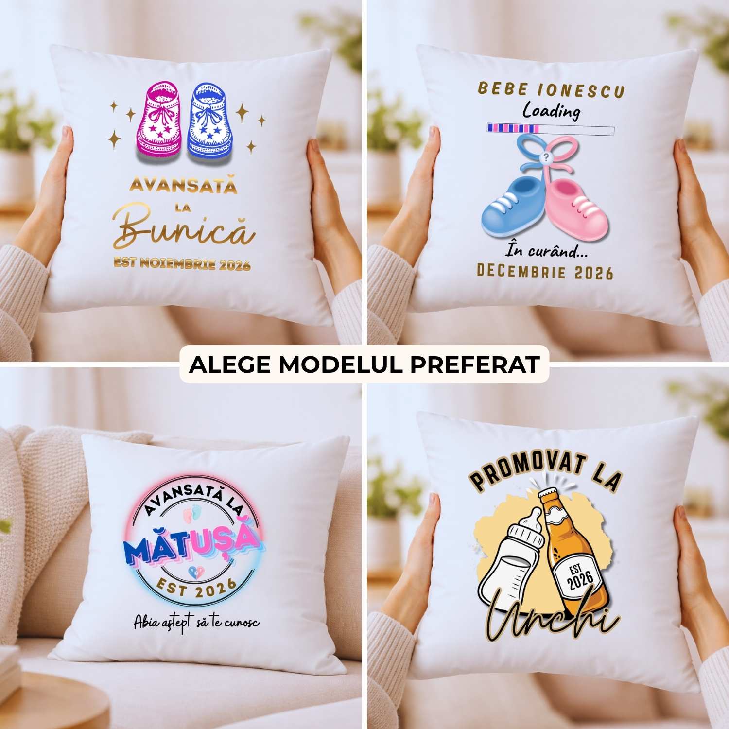 Comandă acum! Alege modelul preferat, completează rolul și luna/anul dorit, iar noi transformăm vestea voastră într-o pernă personalizată anunț sarcină „Avansat(ă) la…” realizată cu grijă, atenție la detalii și mult suflet. Este genul de cadou care nu doar se oferă, ci creează un moment de neuitat și o amintire păstrată la vedere zi de zi.