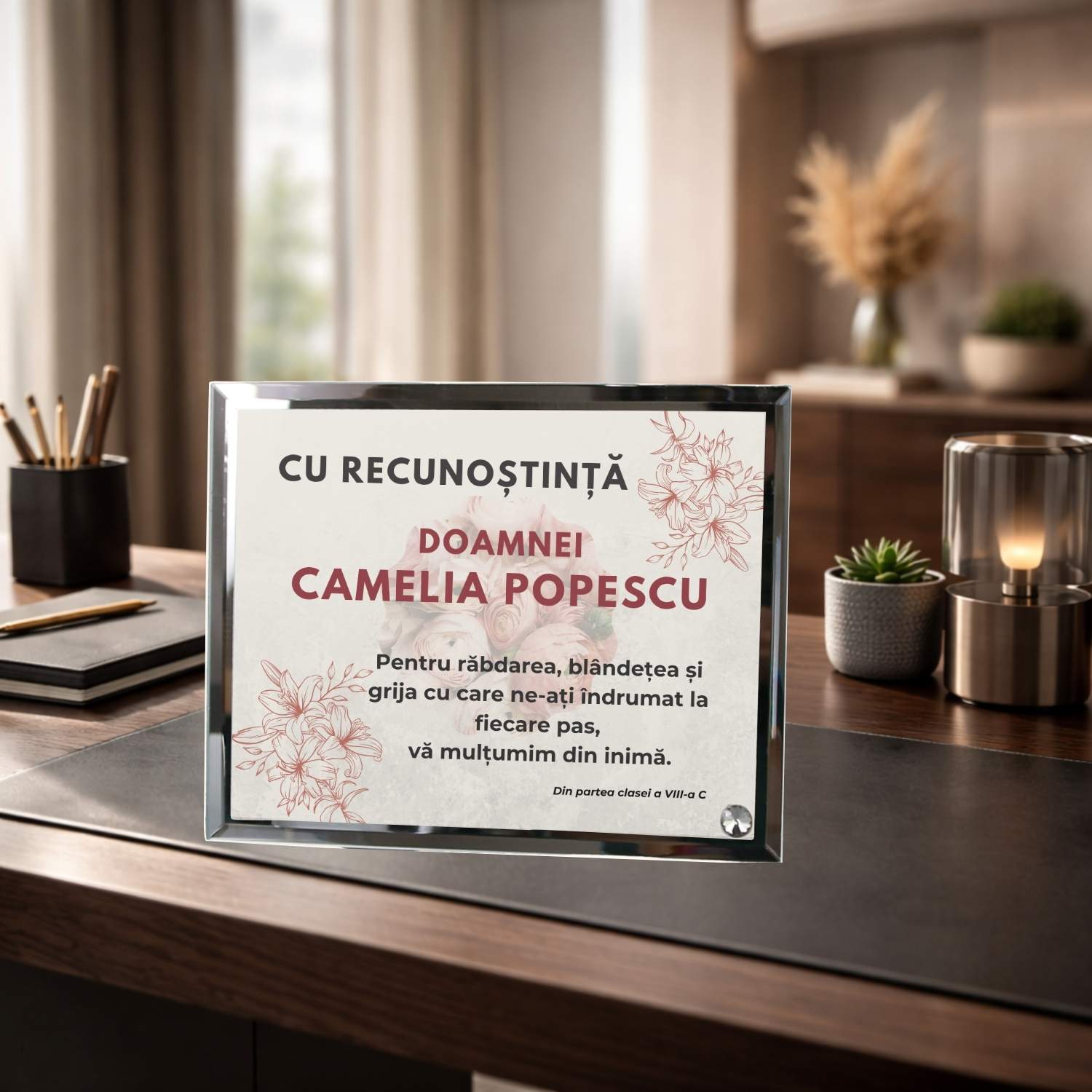 Plachetă apreciere profesoară personalizată. Model Certificat de apreciere, cadou elegant de sfârșit de an personalizat din sticlă.