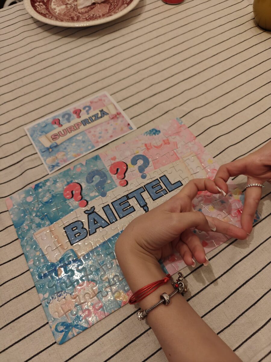Vrei o dezvăluire de gen diferită, care să fie și activitate la petrecere? Puzzle-ul nostru Gender Reveal este un cadou surpriză care creează emoție: asamblează puzzle-ul, iar în bannerul din centru apare mesajul final – „Este fetiță!” / „Este băiețel!” (sau textul tău).