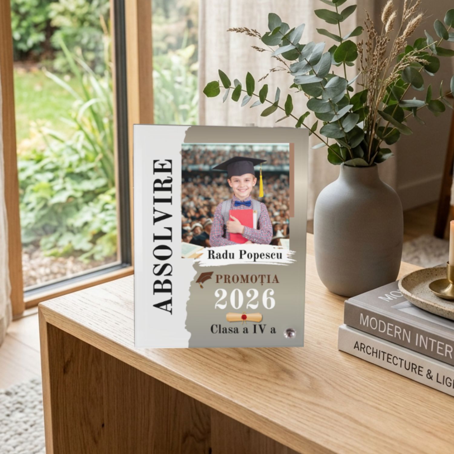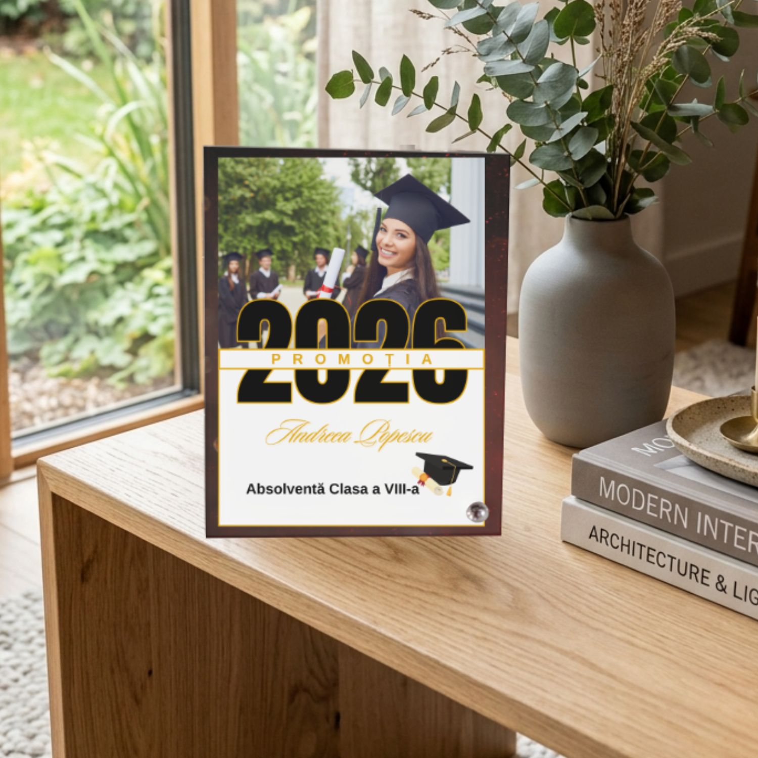 Realizată din sticlă premium cu finisaj mat (frosted), rama se personalizează cu poză, nume, an, promoție și mesaj, iar rezultatul este un cadou potrivit atât pentru absolvent, cât și pentru familie, părinți, nași sau apropiați care vor să marcheze un moment de reușită într-un mod memorabil.