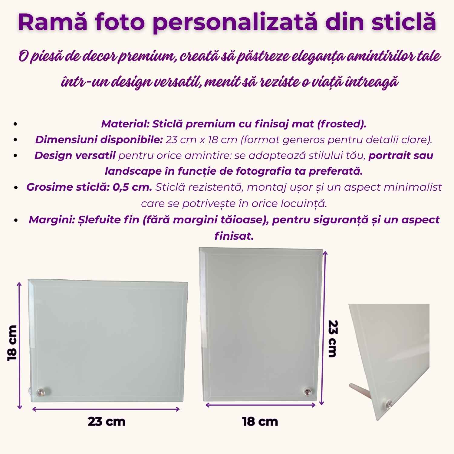 - Conținut pachet: 1 ramă foto personalizată din sticlă + sistem de susținere