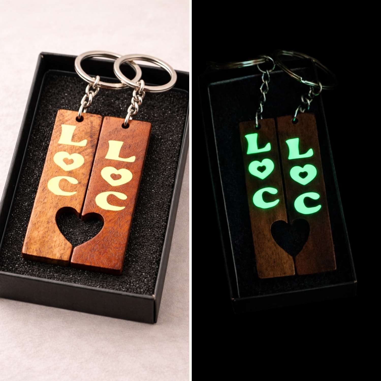 Brelocuri cuplu din lemn cu nume personalizate, glow in the dark – prezentare în mână zi/noapte