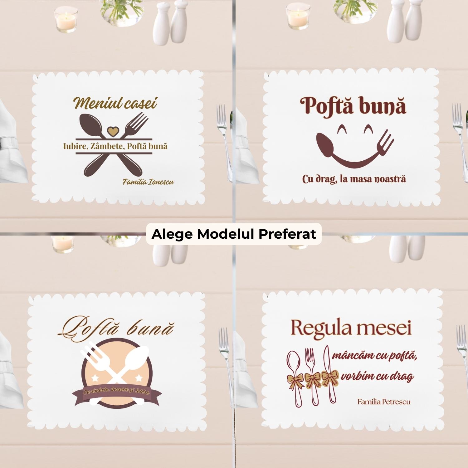 - Selectezi modelul preferat: Meniul casei, Poftă bună, cu drag, Poftă bună la masa noastră sau Regula mesei.