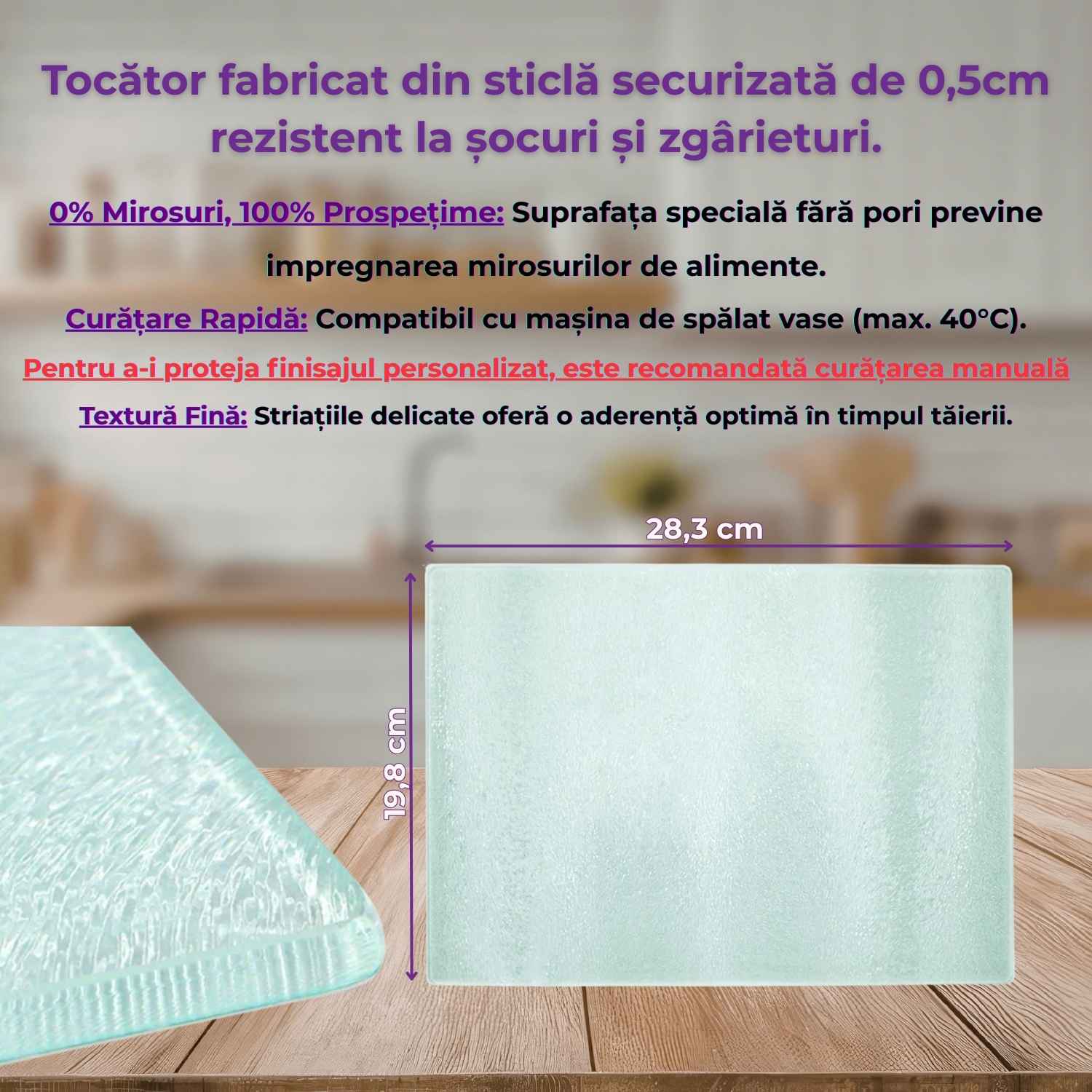 - Material: sticlă securizată, rezistentă la provocările din bucătărie