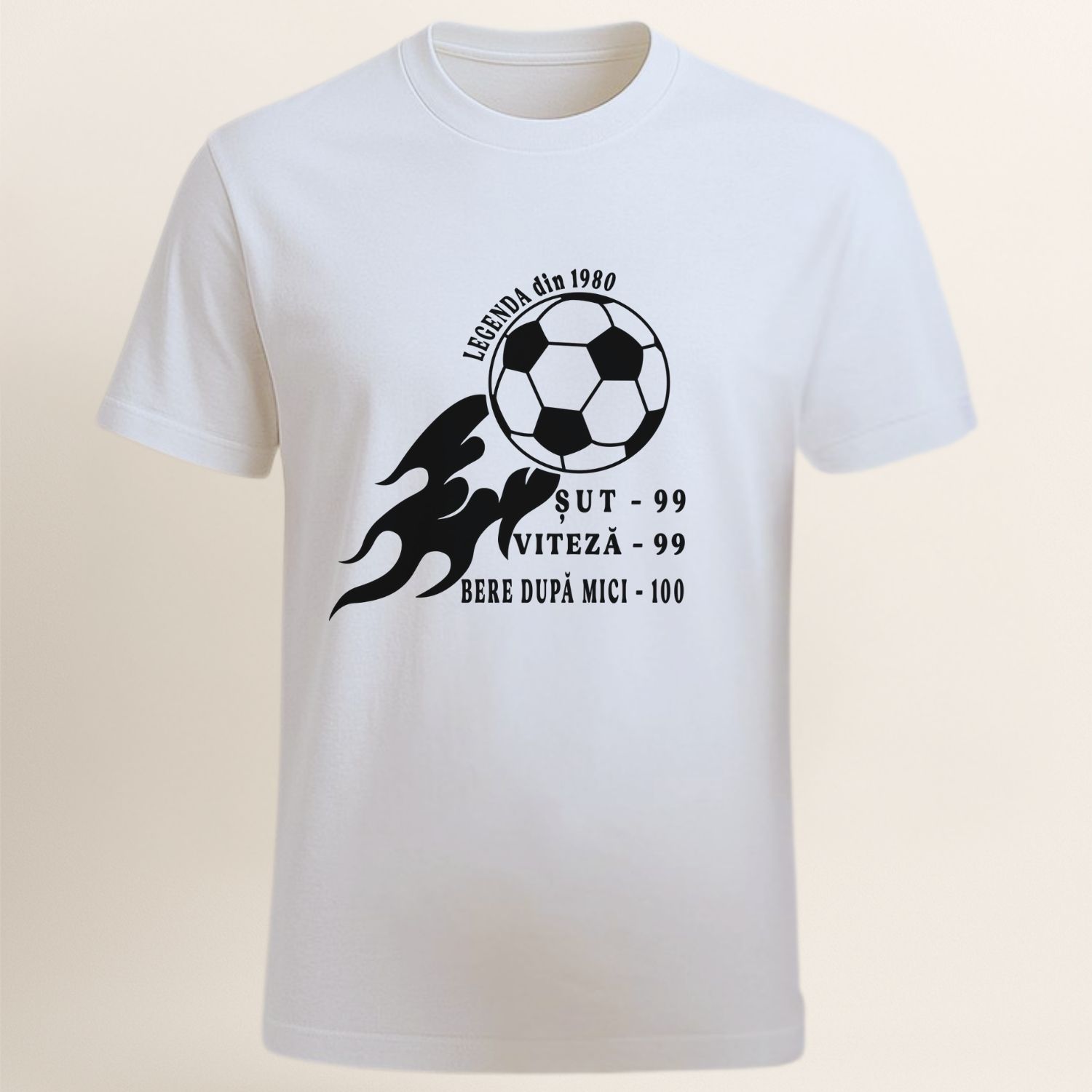 Modelul „Legenda din 1980” combină vibe-ul sportiv cu umorul tipic de microbist și este alegerea ideală pentru pasionați de fotbal care vor un outfit casual, cool și memorabil.