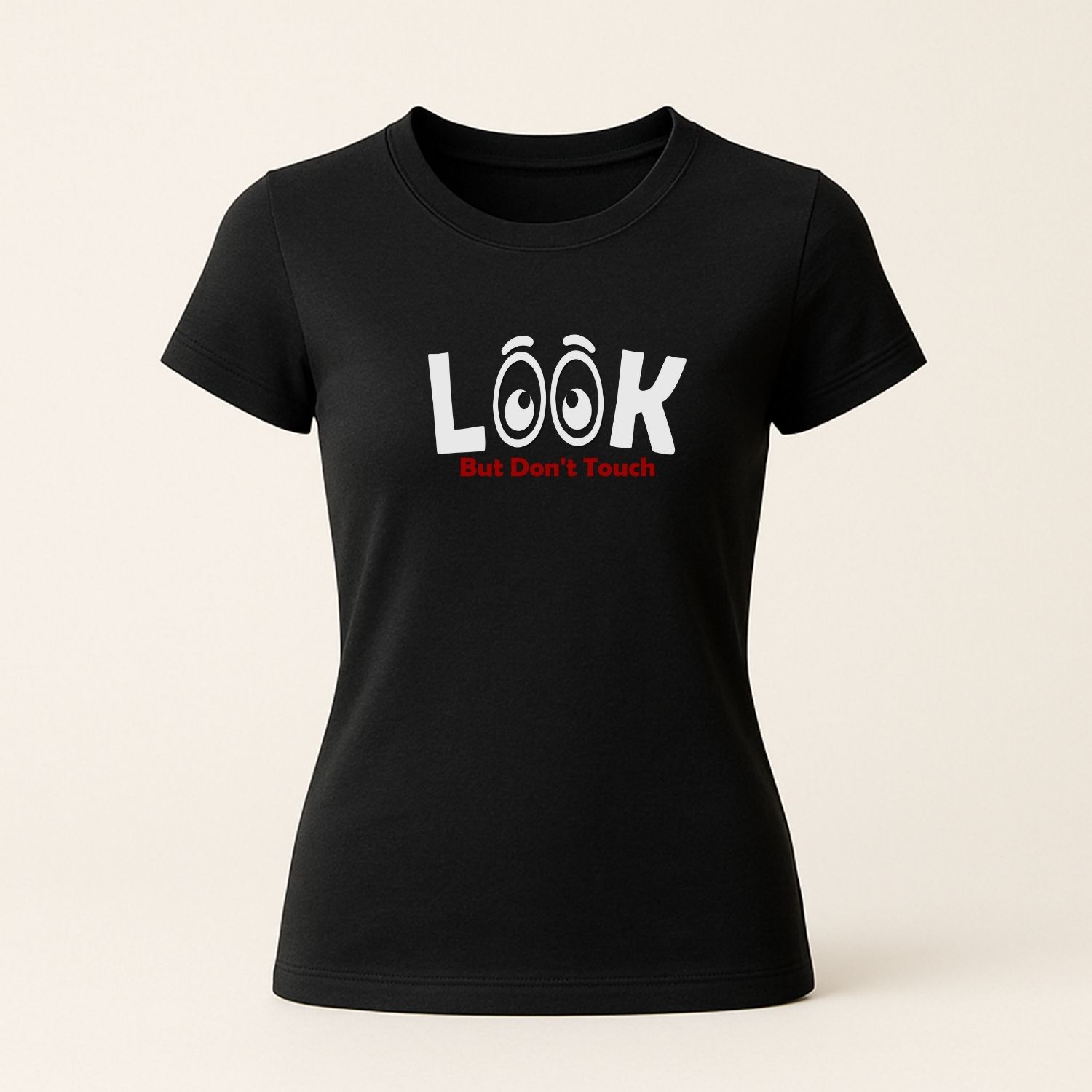 - Tip produs: tricou pentru femei cu mesaj (LOOK but don’t touch)