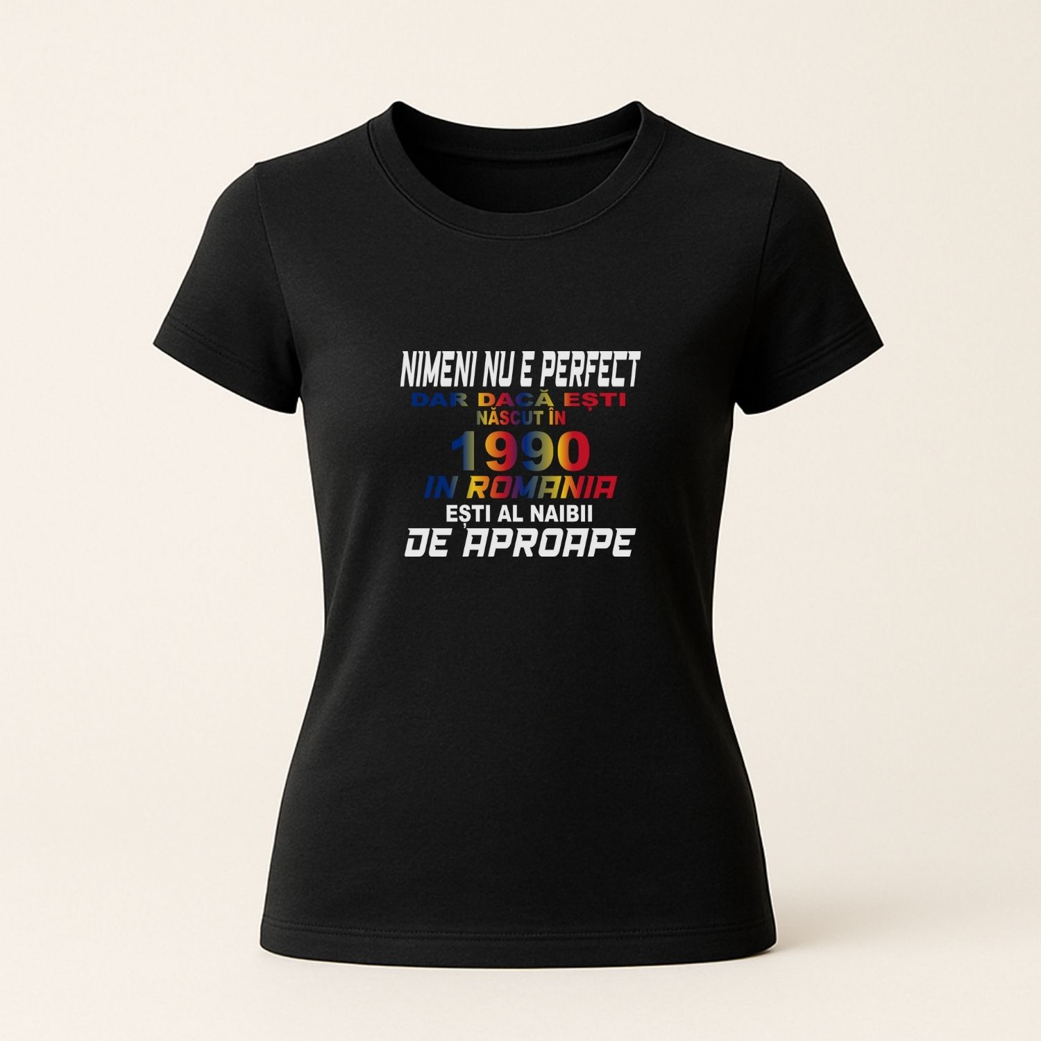 Tricou personalizat unisex Nascut in Romania cu an la alegere negru model femeie