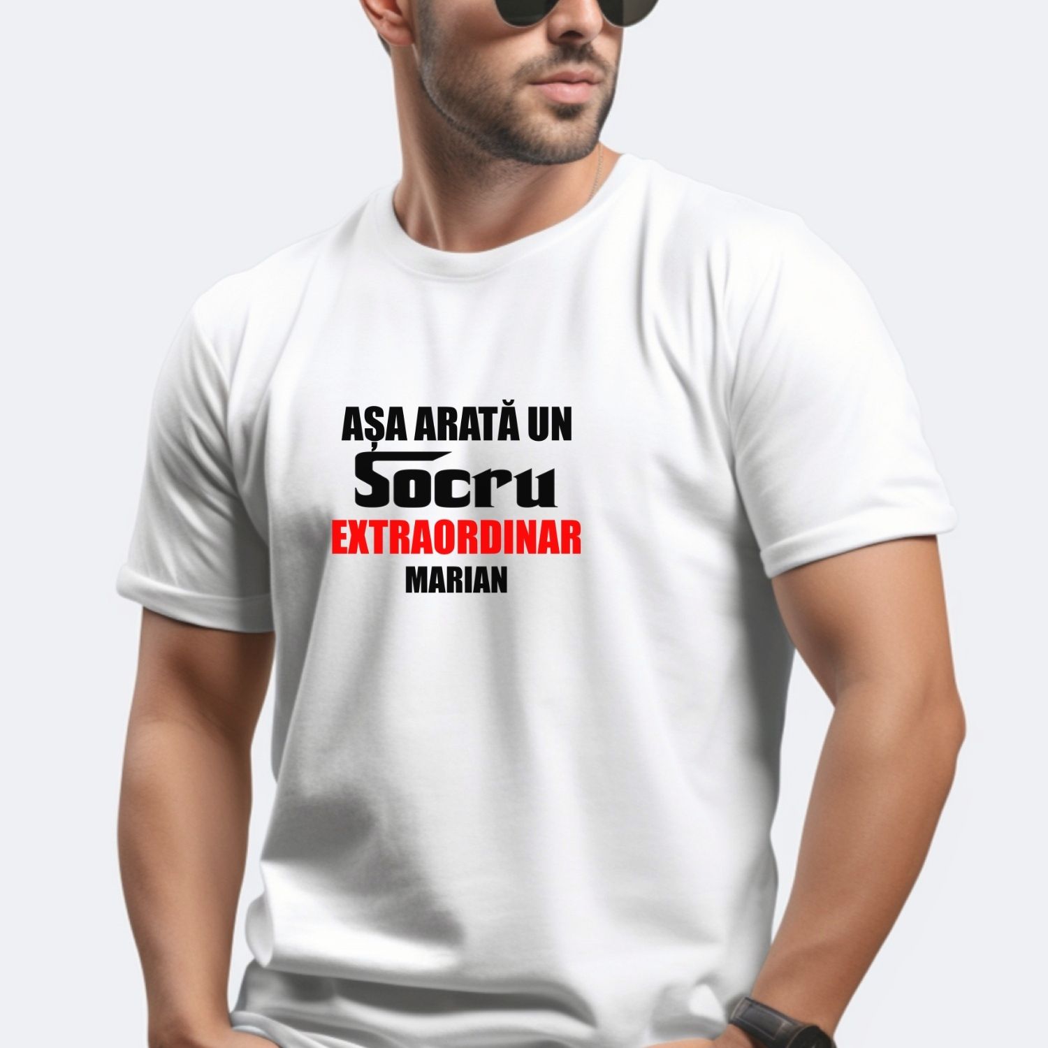 Tricou personalizat pentru socru, model Așa arată un socru extraordinar, alb, cadou de zi de naștere pentru socru