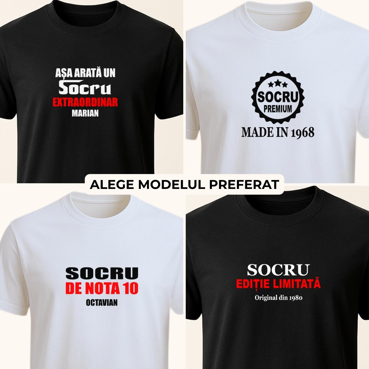 Colaj cu 4 modele de tricou personalizat pentru socru, alb și negru, cadou aniversar cu mesaj și nume