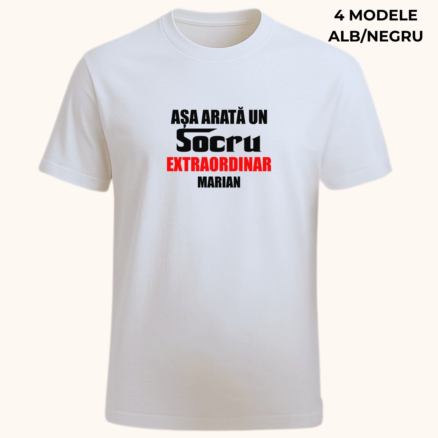 Tricou socru personalizat, model Așa arată un socru extraordinar, alb, cu nume, cadou aniversar pentru socru
