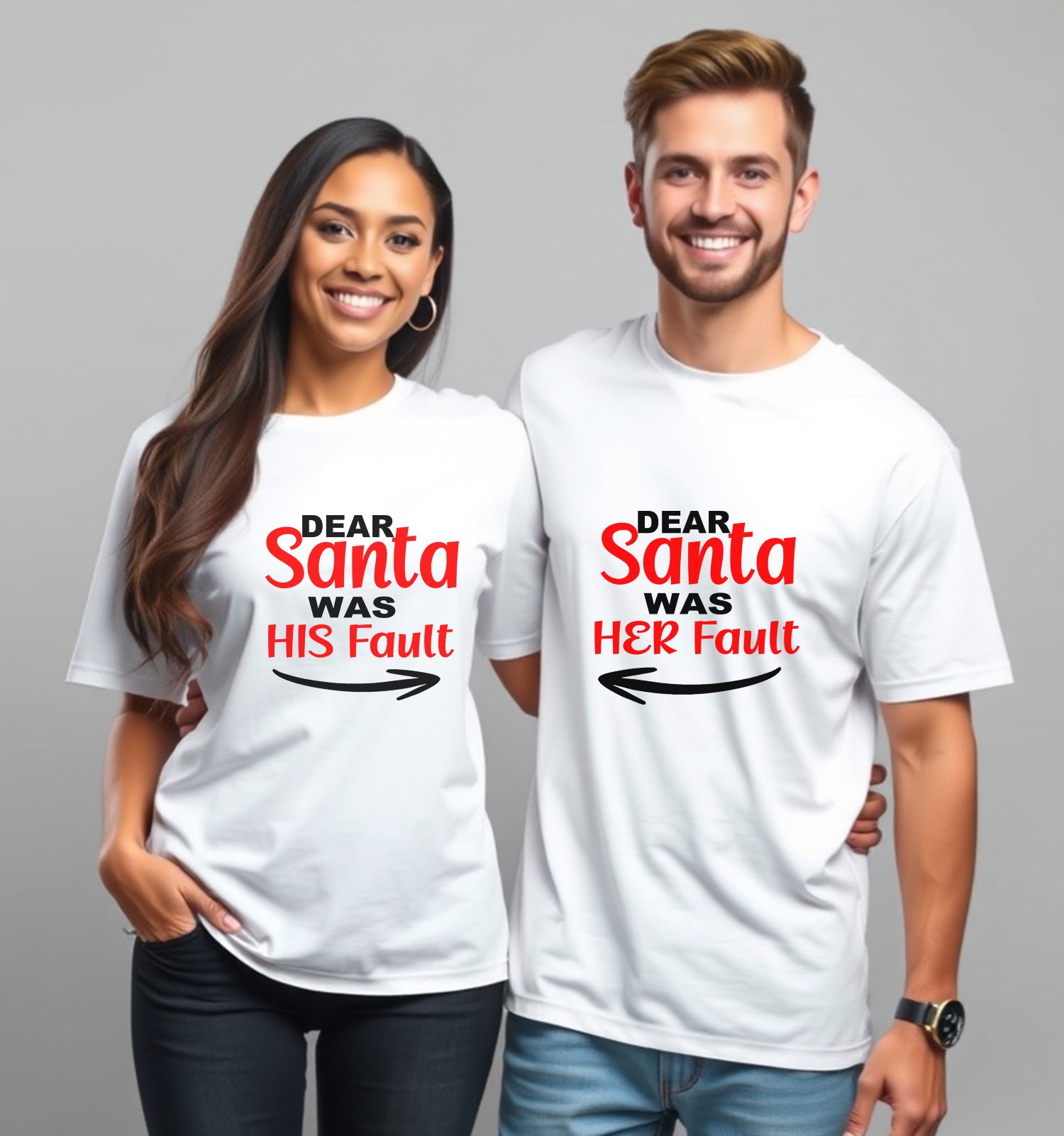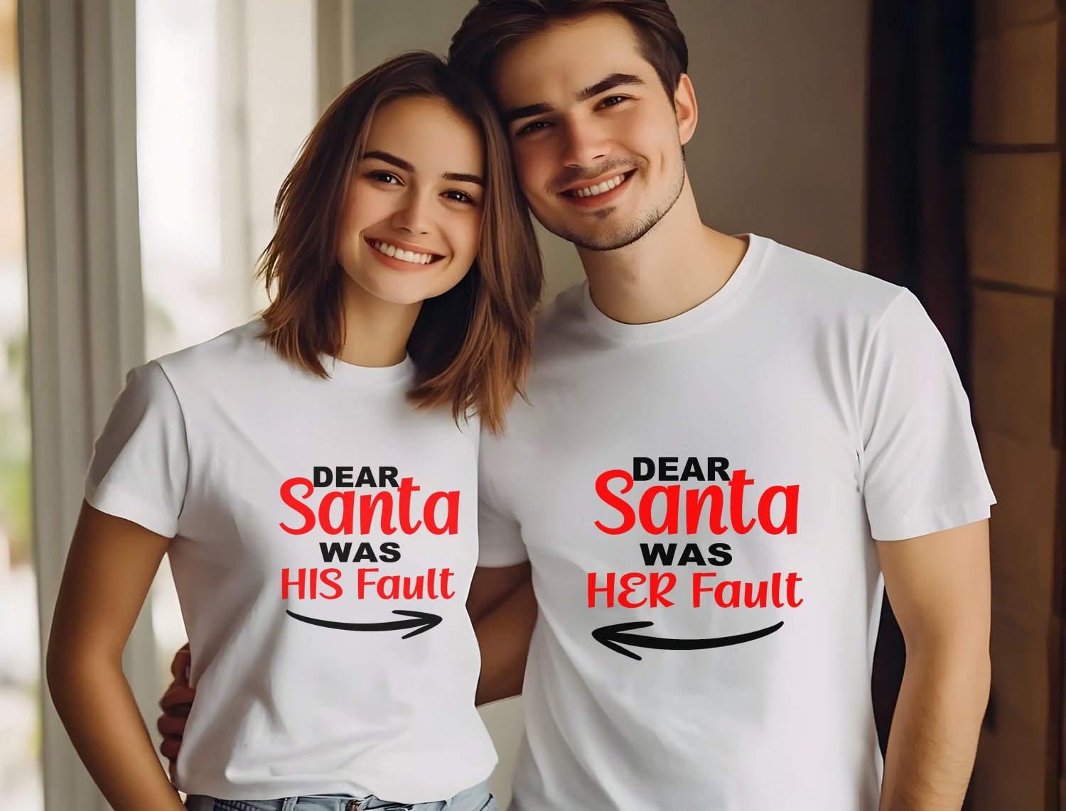 Design perfect pentru cupluri – amuzant, sincron și super fotogenic – Setul de tricouri Dear Santa Was His Fault / Her Fault este creat special pentru cuplurile energice, jucăușe și conectate. Potrivite pentru iubiți, soți, logodnici, proaspăt căsătoriți, de purtat la petreceri de Crăciun, Secret Santa, ședințe foto în familie, outfit-uri casual de sărbători, plimbări, cadouri în gașcă, ținute identice, haioase și pline de personalitate. Grafica simpatică, culorile vii și mesajul în oglindă creează un efect super fun, ideal pentru poze virale.